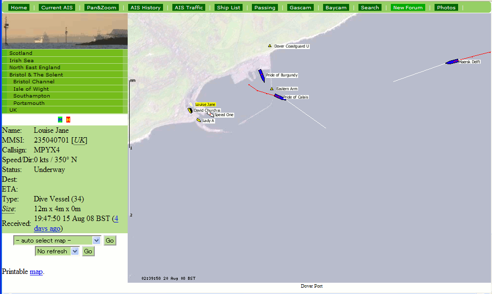 上の図はANDYの船、LOUISE JANEの現在位置(イギリス時間2008年8月20日午前3時現在)です。