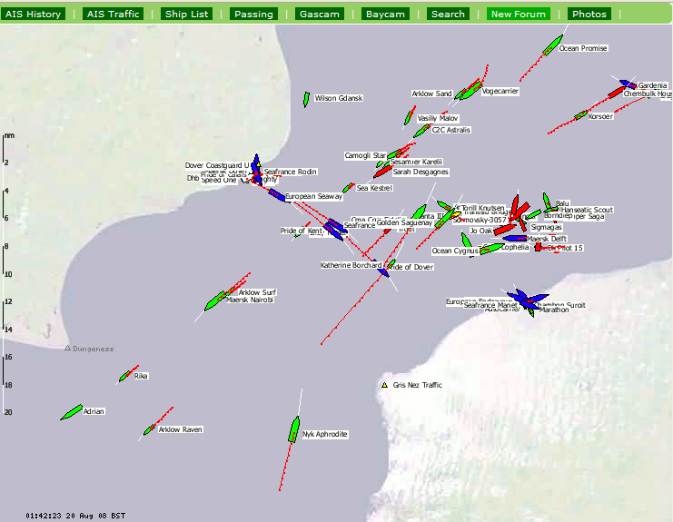 この図は2008年8月20日午前2時時点での英国海峡、馴染み深い日本風に言うとドーバー海峡を往来している船の位置を表示したものです。これは、イギリス周辺の船の往来をリアルタイムで表示するCurrent AIS mapっていうサイトからもってきました。