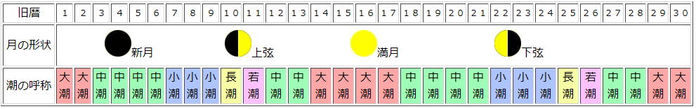 昔から海を生活の場としてきた漁師さんや、海で釣りをする人の間では、潮の満ち引きの大きさなどの状態を表現する用語として、大潮・中潮・小潮・長潮・若潮と言う言葉が良く用いられています。 潮の干満は、月や太陽などの引力によって引き起こされるものです。特に地球に一番近い距離にある「月」の運動が潮の干満に大きく影響しています。この「月」を基準として作られた暦の「旧暦」と「新月」や「満月」等の「月の形状」を基準として、大潮・中潮・小潮・長潮・若潮の用語の区分けをすると次のようになります。