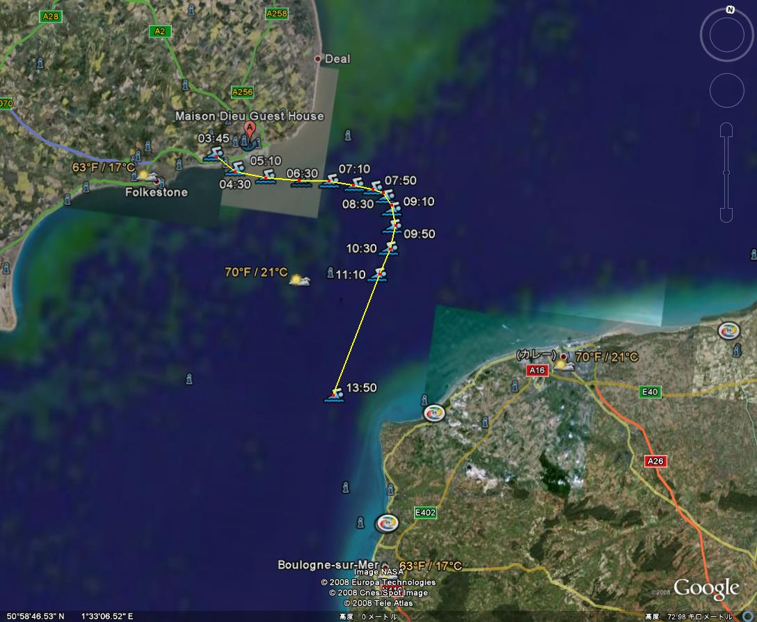 連絡つかないので、場つなぎエントリー 大雑把ですが13時50分までに泳いだ距離を測ってみました。 google earthによると約44キロでした