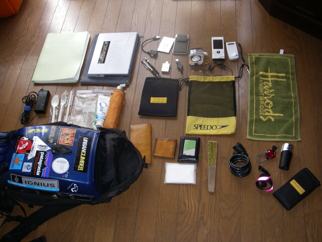 デジカメと予備バッテリ、自転車用ライト(単三×4)、willcomの携帯、GDDphone、iPod、腕時計(suunto core)、blue toothマウス(単三×2)、vaio