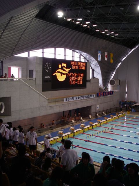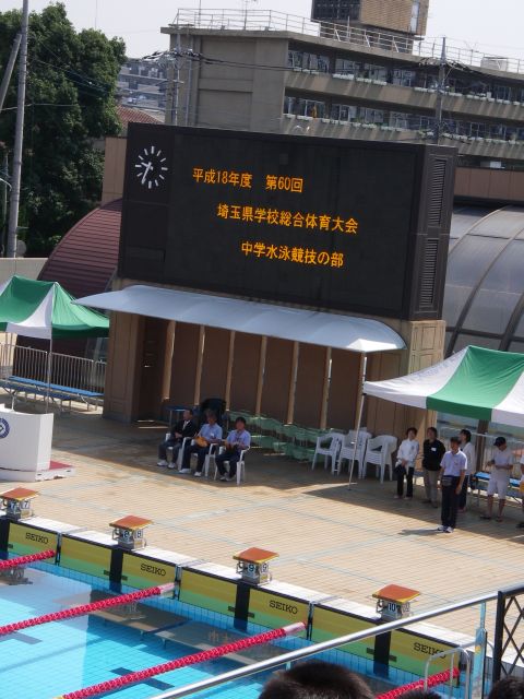 埼玉県学校総合体育大会、中学水泳競技の部がはじまりました。会場は川口の青木町公園プール。