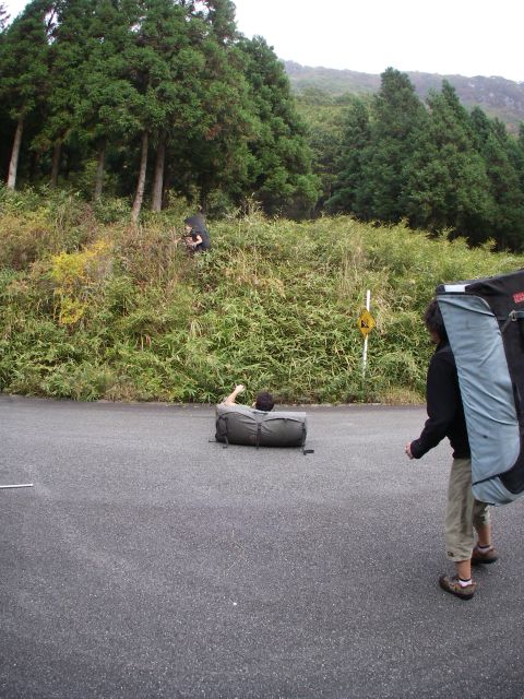 ノブさん二回目のトライ中に突然雨が降り出して一時中断して雨宿り。